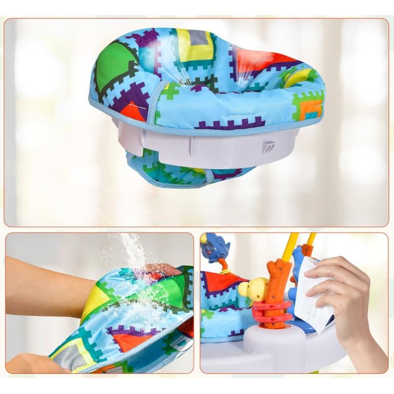 Zawartość opakowania::Obrotowe zabawki, Lusterko z motywem małpki, Spiralne tory dla piłeczek, Grzechotki i zawieszki, Ruchome elementy i sprężynujące postacie, Stabilne siedzisko z materiału odpornego na zabrudzenia