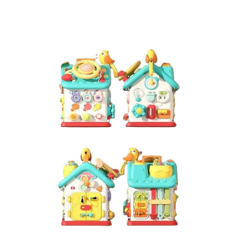 Zawartość opakowania::Edukacyjny domek z wbudowanymi elementami interaktywnymi, Zestaw śrubek i kluczy, Zestaw do gry "karmienie ptaszka", Komplet pasów, zamków i elementów do ćwiczenia dłoni