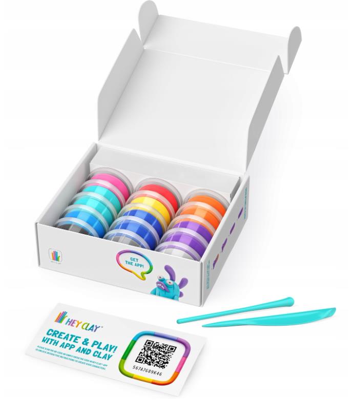 Zawartość opakowania::15 puszek z masą plastyczną w różnych kolorach, 2 specjalistyczne narzędzia do modelowania, Instrukcja obsługi, Kod QR -Dostęp do aplikacji HEY CLAY